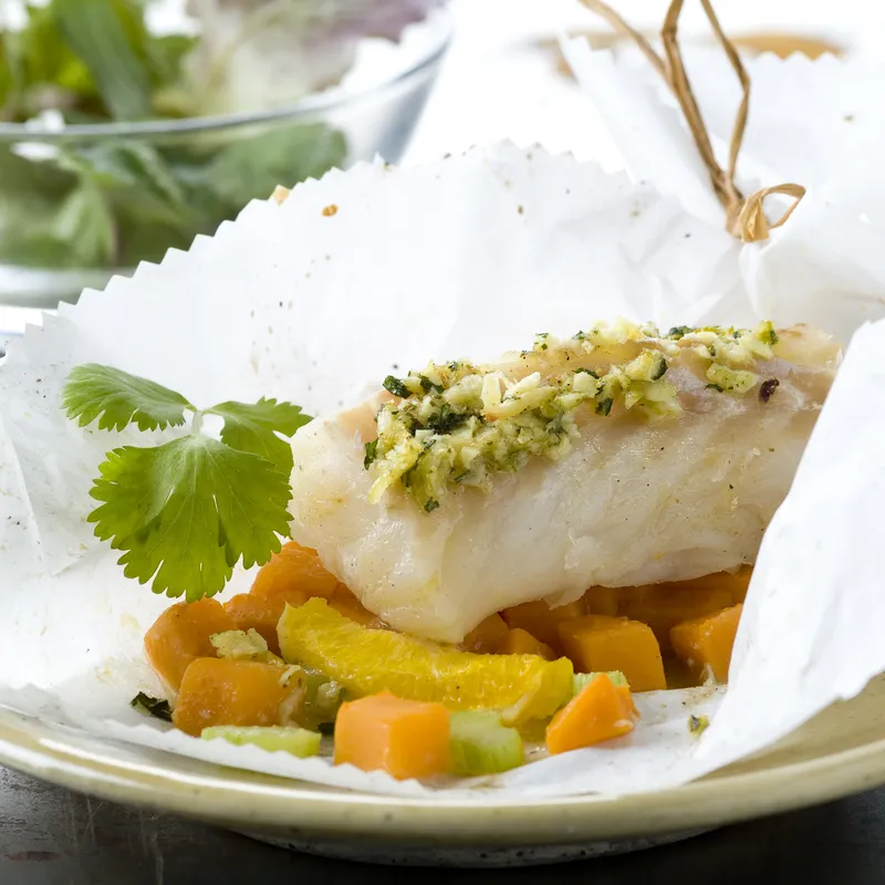 - 5 Reparta el boniato el apio y la naranja entre las hojas del papel de hornear. Coloque en cada hoja un filete de bacalao y riéguelo con un poco de marinada.