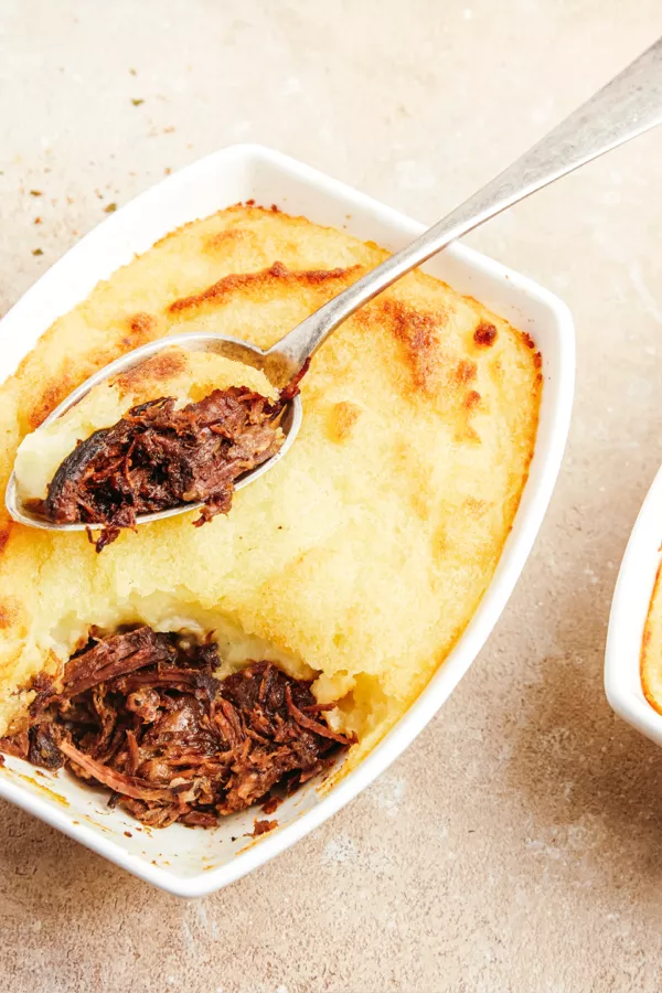 - 8 Répartissez la viande dans un plat à gratin et ajoutez la purée de pommes de terre. Faites cuire au four à 180 °C pendant 20 minutes.