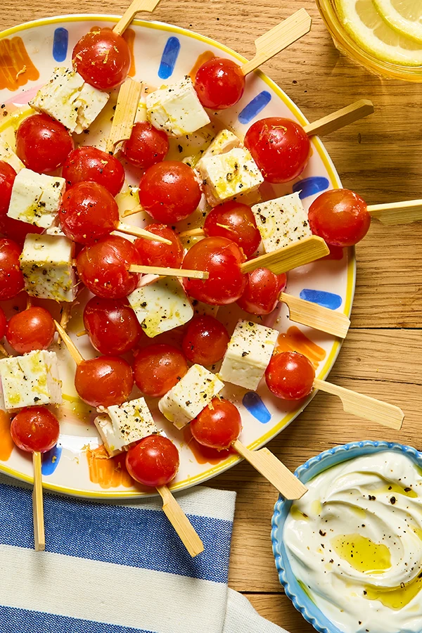 - 2 Venez embrocher une tomate cerise puis un bloc de fêta sur les pics à brochette.