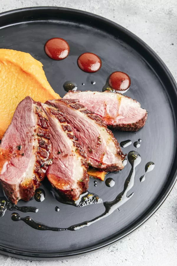 - 7 Émincez les magrets en tranches d'environ 1,5 cm d’épaisseur. Servez accompagnés d'une purée de patate douce.