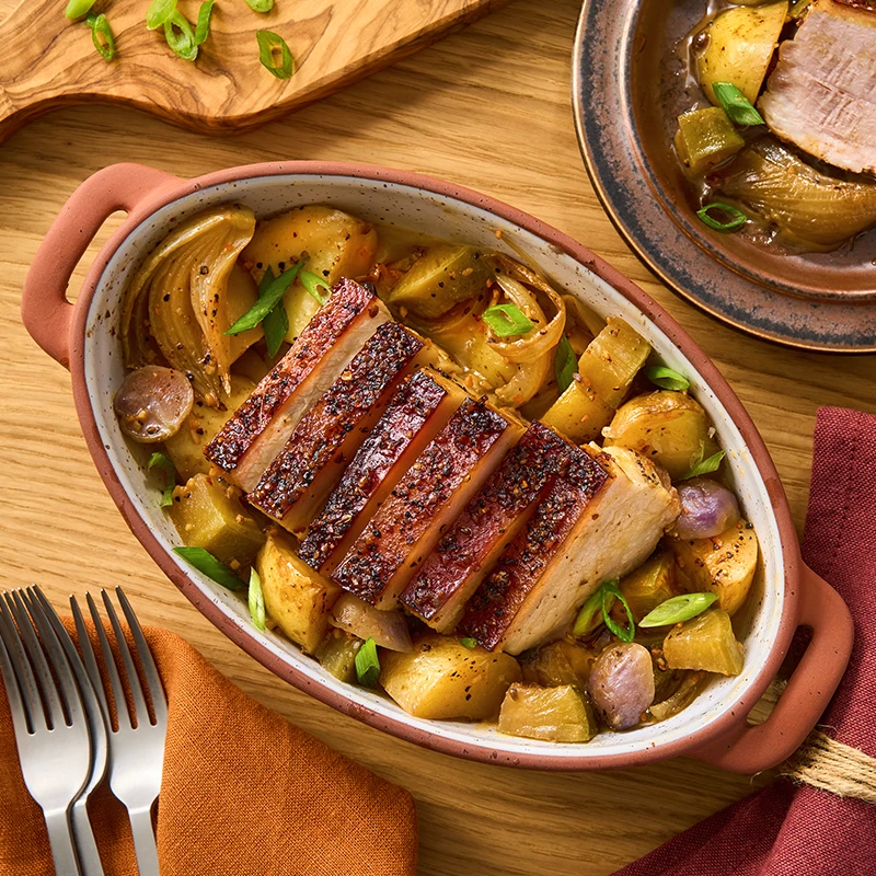 - 7 Une fois la cuisson terminée, laissez reposer 30 minutes au four éteint, émincez l’oignon nouveau et disposez-le sur le plat.