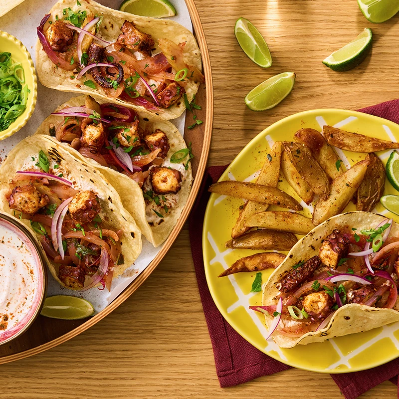 - 7 Ajoutez le poulpe sur la tortilla, la préparation de légumes, les oignons nouveaux, le persil ciselé, et quelques oignons rouges crus. Répétez l’opération, puis parsemez d’épices et de jus de citrons verts.