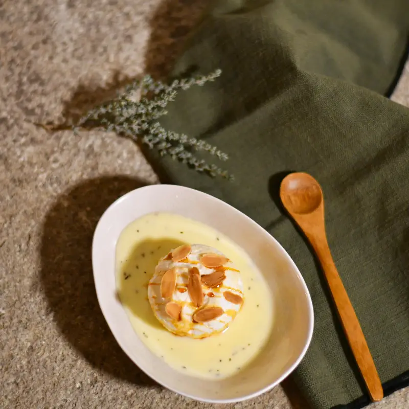 - 3 Pour la crème anglaise : Versez le lait dans une casserole et portez-le à ébullition. Ajoutez le thym et laissez infuser pendant 10 minutes.