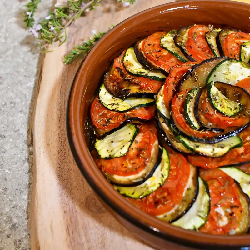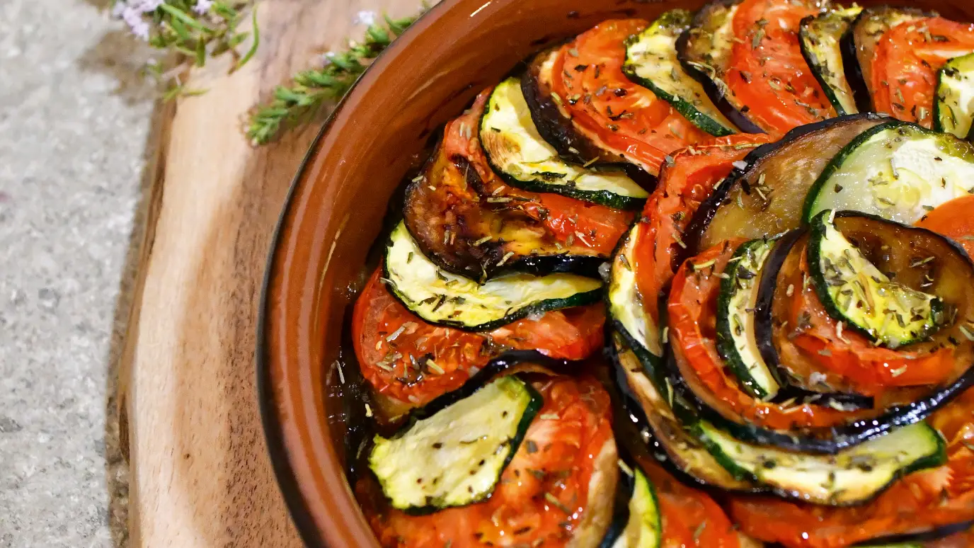 - 3 Coupez les aubergines, courgettes et tomates en rondelles de la même épaisseur. Disposez les oignons dans le fond d'un plat allant au four. Disposez les légumes en tranches dans votre plat en les intercalant. N'hésitez pas à bien les serrer et à les tasser légèrement.
