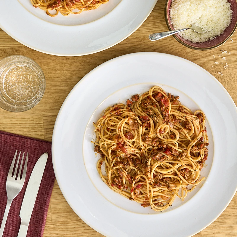 Incorporez les tomates pelées, la cuillère à soupe d’herbes de Provence, la cuillère à café d’ail semoule et salez. Mélangez, laissez mijoter pendant 10 min environ à feu doux, en remuant régulièrement. - 3 Pendant ce temps, cuire les spaghettis dans l’eau bouillante en suivant les instructions du paquet ou jusqu’à ce qu’ils soient al dente. Lorsque les spaghettis sont cuits, égouttez-les et réservez-les au chaud. Quand la sauce bolognaise est prête, ajoutez quelques tours de moulin de poivre noir, puis nappez-en les spaghettis. Dégustez aussitôt.