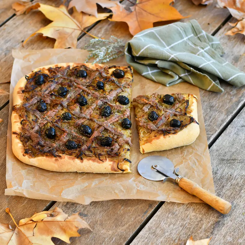 - 4 Étalez la pâte au rouleau sur une plaque de cuisson recouverte de papier sulfurisé légèrement fariné. Répartissez la compotée d'oignons sur la pâte et répartir dessus les filets d'anchois restants et ajoutez quelques olives noires.