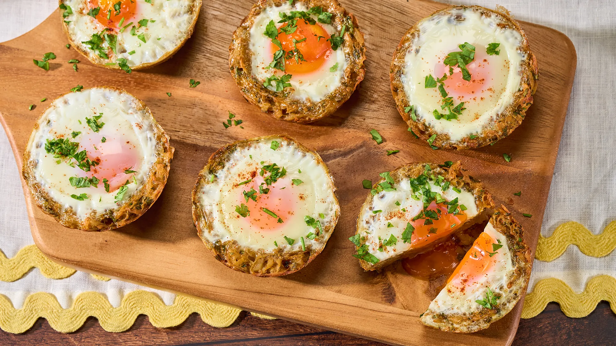 - 5 Sortez le moule du four, cassez délicatement un œuf dans chaque nid précuit, puis remettez au four environ 8 minutes supplémentaires jusqu’à ce que le blanc soit pris, mais le jaune encore coulant.