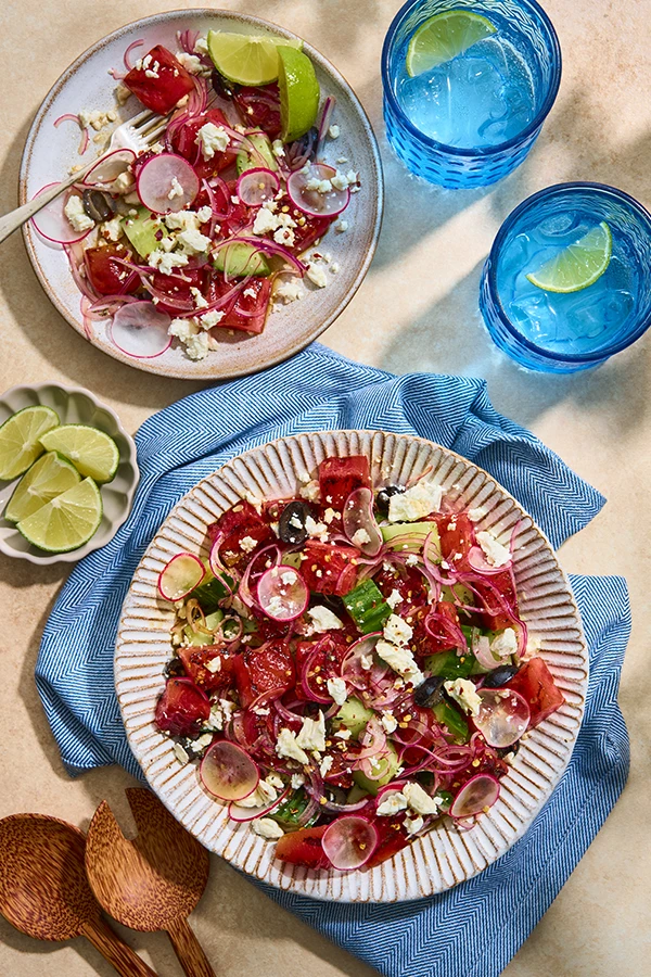 - 3 Dans un grand saladier, mélangez délicatement la pastèque grillée, l’oignon, les olives, le concombre, la menthe ciselée, les radis et la vinaigrette.
